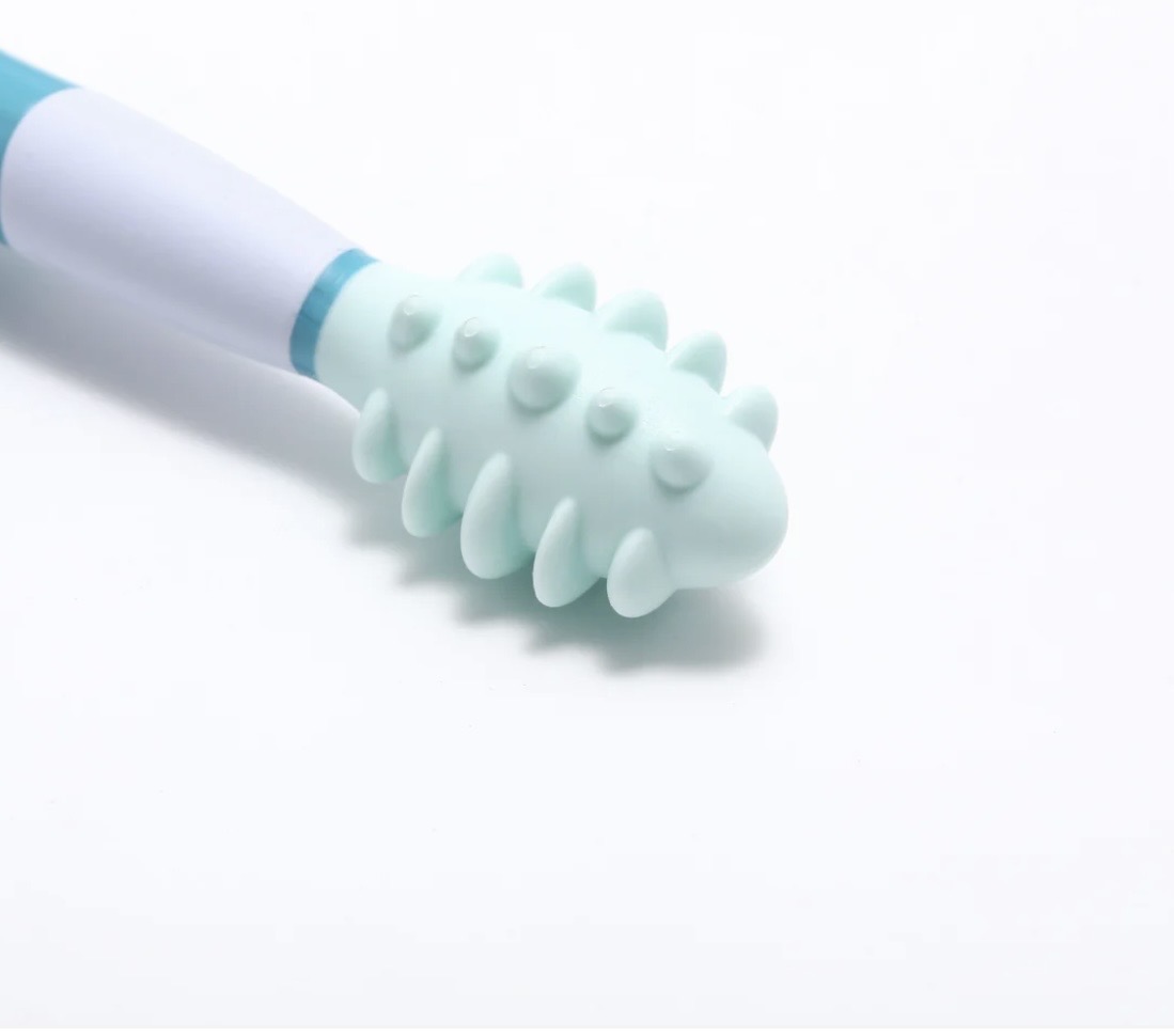 - Feeding Therapy: The soft, nubby head is designed to hold small tastes of purees, liquids, or soft crumbs, allowing it to function as an introductory “spoon”.